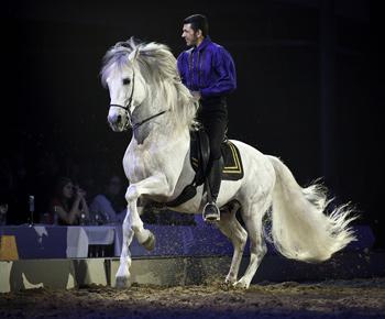 60 tane olduğu söylenen (ama tabii ki sayamadığımız) atların çoğu Endülüslüymüş, arada iri Hollanda atları ya da midilliler de vardı. Gösterinin asıl efendisi Miguel Barrionuovo, at eğiticisi ve şovmeni hazırlamış bu gösteriyi. Gerçekten Endülüs Malaga’lıymış, ve nesillerdir ataları atlarla çalışırlarmış, dolayısıyla birlikte yaşarlarmış. Gösteride atların başka efendileri de vardı, (bazıları ailedenmiş) ve adamların çoğu Kuzey Afrikalı gibi geldi bana.
