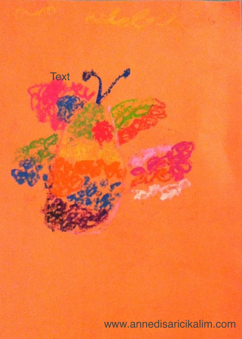 Sonra da turuncu fon kağıdına noktalardan oluşan bir kelebek yapmış. Kelebek çok renkten ve çok noktadan oluşuyor. Bugünlerde en çok kelebek yapıyor zaten. Noktalama ise anneannesinden öğrendiği bir minyatür tekniği, kızım türler ve teknikler arası dolaşıyor. 🙂 (Noktalama tekniği ve minyatür ile ilgili yazıma buradan gidebilirsiniz.)