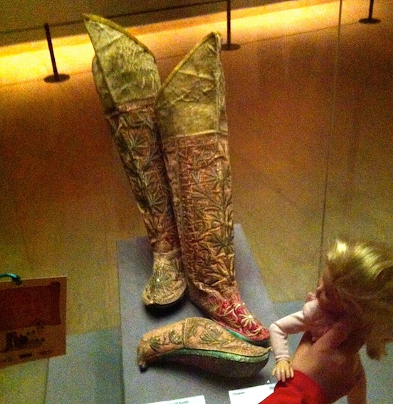 Küçük tur rehberimiz (ve onun sarı saçlı, Polonyalı tipli bebeği) bize sergiyi gezdirirken kumaş çizmeleri bulmamızı istedi, zira afişlerden birinde yer alan ve bizim ipekli kumaşlardan yapılmış çizmeler rehberimize çok enteresan gelmişti. Biz de bulduk.
