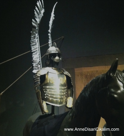 Giysiler, halılar, haritalar, savaş ekipmanları, o döneme ait tarihi bilgiler, çadır ve Osmanlı “delil”lerinden esinlenerek geliştirilmiş “hussar”ı gördük. Rehberimiz at ve çadırla ilgilendi, biz diğerleriyle. Hussar neymiş ben sesli okudum, rehber de hemen buldu bize gösterdi. Ağır zırhlı, baş ve omuzlarına kanat takan, soylu ve kahraman, atlı savaşçılar.